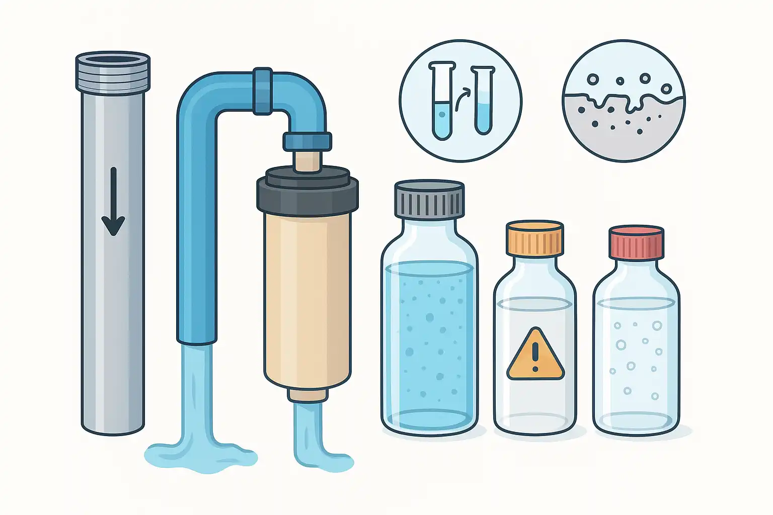 اگر قصد دارید با اطمینان یک محلول احیای چاه آب متناسب با جنس لوله و فیلتر انتخاب کنید، باید مشخص کنید سیستم شما فلزی است یا پلاستیکی، همچنین نوع فیلتر مهم است؛ فیلترهای شنی، الیافی یا رزینی، هرکدام به محلولهای خاص نیاز دارند تا بدون آسیب و کاهش کارایی، رسوبات آهن و منگنز را پاک کنند.