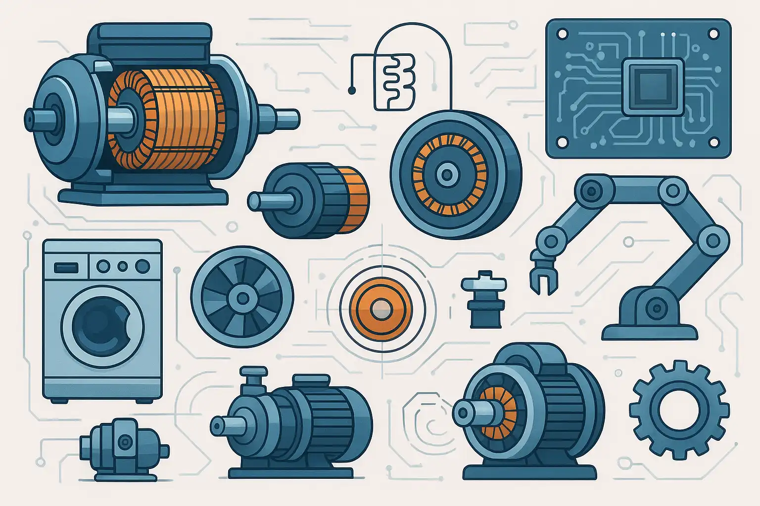 امروزه موتور الکتریکی در انواع مختلفی تولید میشود تا پاسخگوی نیازهای متنوع صنعتی، خانگی و پژوهشی باشد. هر کدام مزایا و کاربردهای خاص خود را دارند و در ادامه رایجترین انواع را بررسی میکنیم: