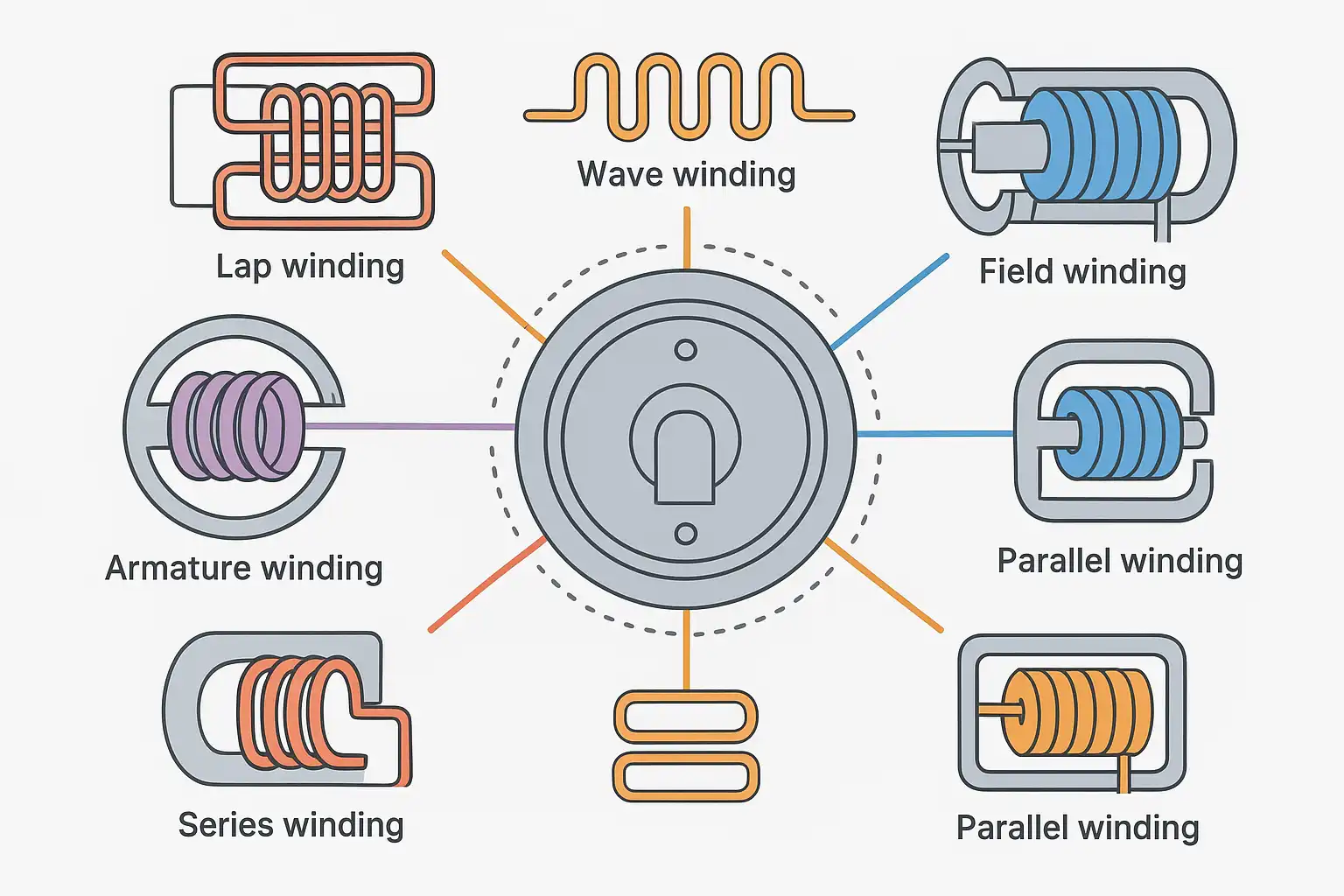 هر یک از این واژگان، به نوع خاص یا محل خاص سیم‌پیچی در ساختار موتور اشاره دارد. به‌عنوان مثال، Lap Winding در موتورهای جریان مستقیم با توان پایین‌تر استفاده می‌شود؛ درحالی‌که Wave Winding معمولاً در موتورهای توان بالاتر کاربرد دارد.