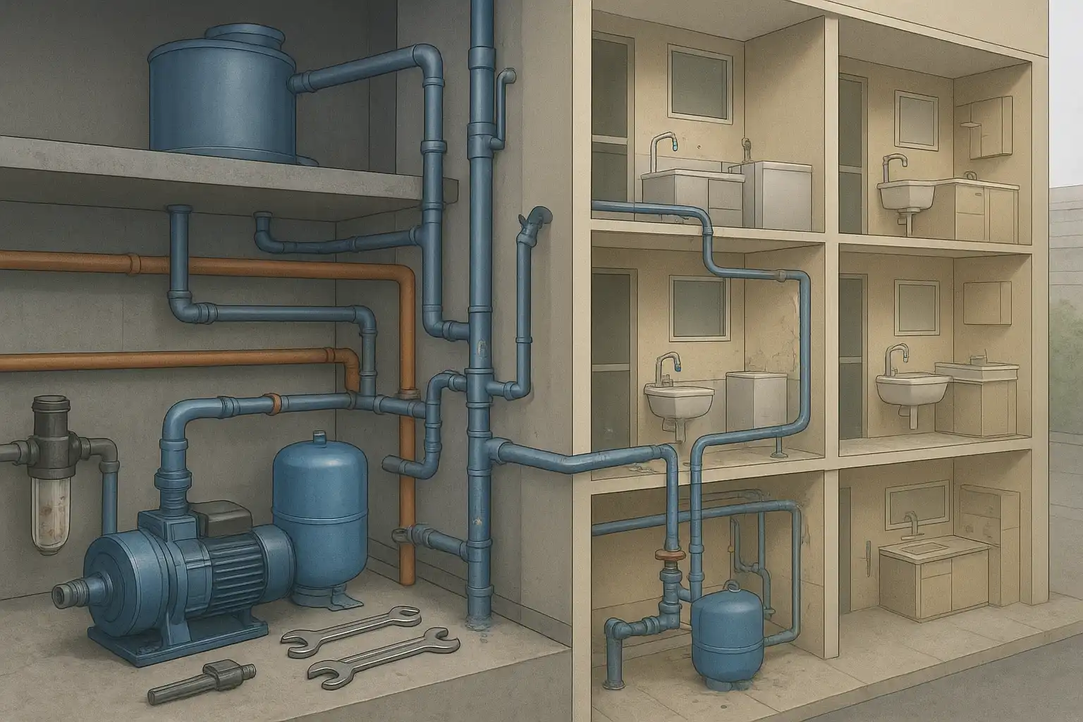 نصب منبع ذخیره آب در پشت بام یا موتورخانه و بهرهگیری از بوستر پمپ، معمولاً فشار مطلوب آب را برای همه طبقات مهیا میکند. با این حال، اگر ظرفیت منبع و پمپ به درستی انتخاب نشده باشد یا مسیر لولهها مناسب نباشد، ممکن است همچنان با مشکلاتی روبهرو شوید. بررسی فنی و محاسبه دقیق ظرفیت، شرط اصلی موفقیت این راه حل است.