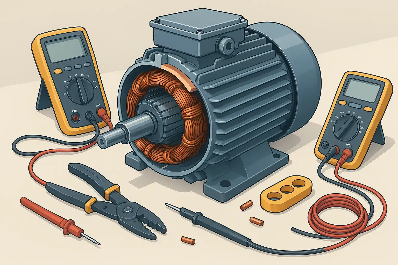 ارزیابی کیفیت سیم پیچی الکتروموتورهای سه فاز چند مرحله دارد. نخست باید شواهد ظاهری مثل منظم بودن سیمپیچ، عدم وجود آسیب مکانیکی و سالم بودن عایق بررسی شود. سپس تست اهمی با دستگاه مولتیمتر انجام میشود تا مقاومت هر فاز اندازهگیری گردد و از تعادل مقدار مقاومت در سه فاز اطمینان حاصل شود. این کار برای برقکاران حرفهای یک گام ضروری است و مانع از ایجاد جریان نشتی یا اتصال کوتاه میشود.