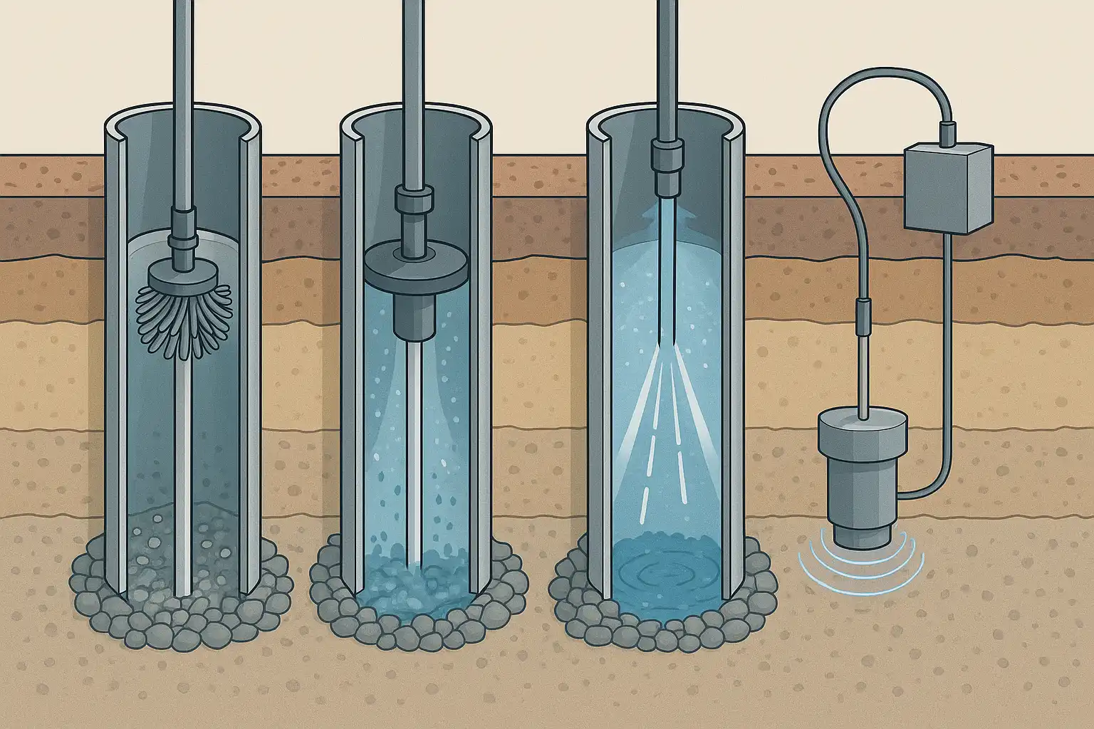 برای رفع گرفتگی، روشهای مختلفی به کار میرود که هر کدام مزایا و محدودیتهای خاص خود را دارند. اگر قصد دارید بهترین راهکار را برای چاه آب خود انتخاب کنید، شناخت این روشها ضروری است. متداولترین روشها شامل برسزنی، پیستونزنی، واترجت، امواج فراصوت (آلتراسونیک) و در موارد خاص طناب انفجاری است.